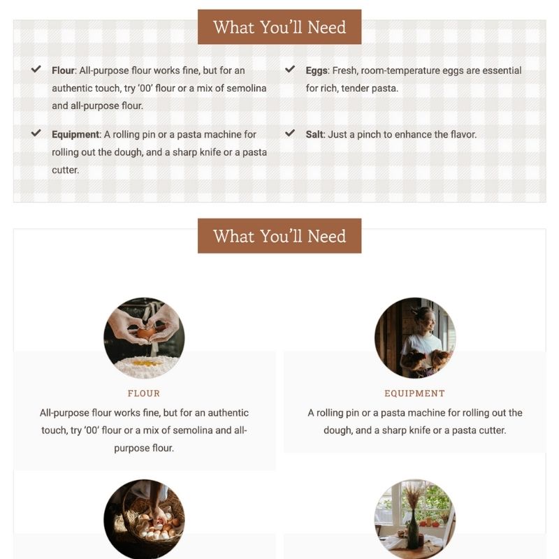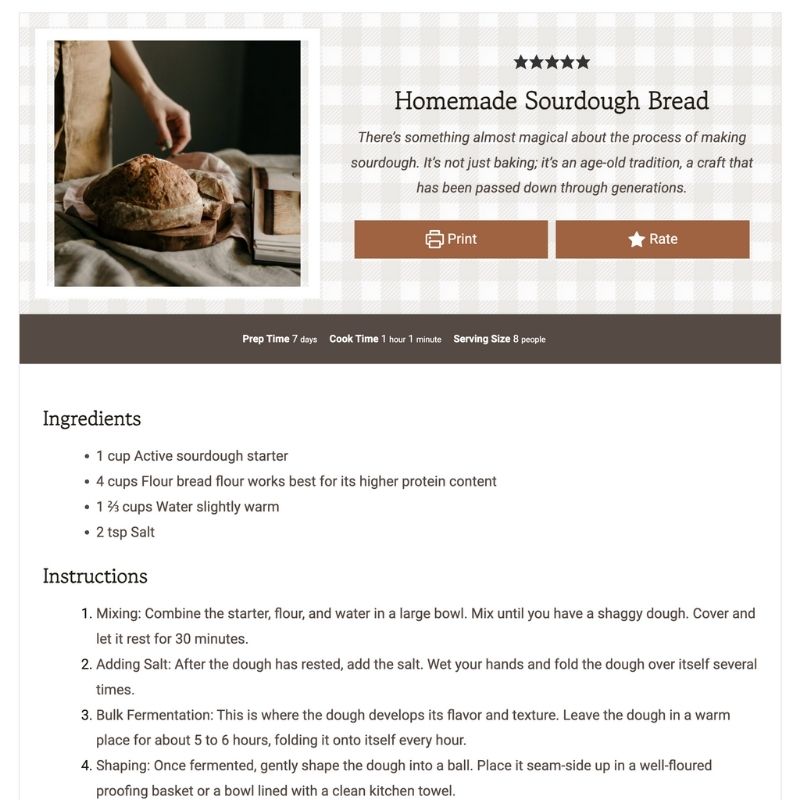 Homestead comes with a matching Recipe Template that will work with the most popular recipe plugin for WordPress, WP Recipe Maker. This plugin makes it easy to create and publish recipes with a professional look and feel. Plus, Google loves it which means SEO just got a bit easier for you. We’ve made sure the design details of the plugin will be installed to match the overall aesthetic of the theme, providing a consistent and harmonious visual experience for your brand. Whether you’re sharing a family heirloom recipe or your latest culinary experiment, your readers will love being able to print the ingredients, instructions, and nutritional information in an attractive, user-friendly format.